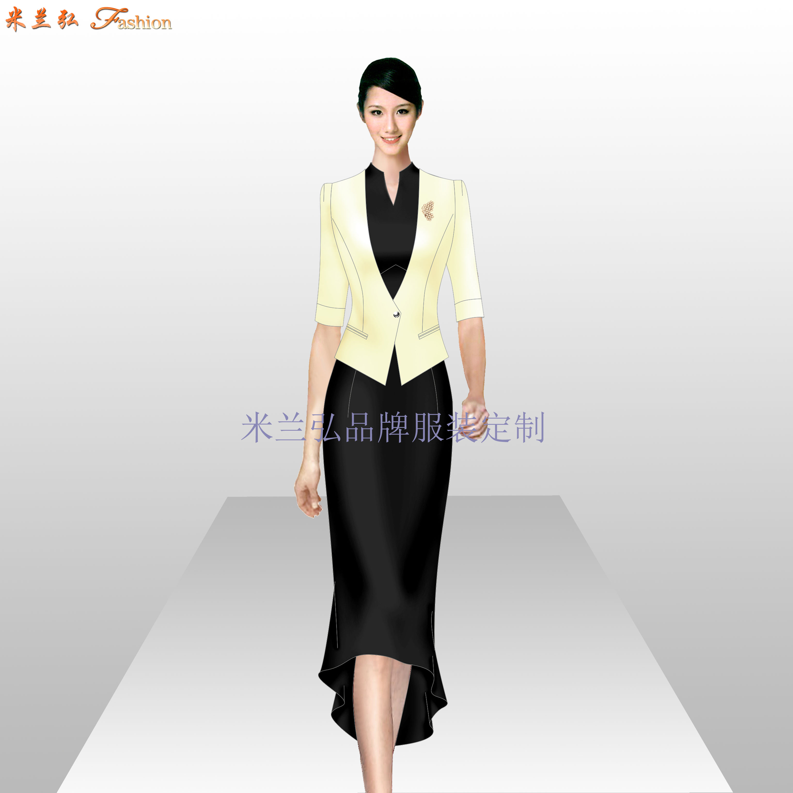 气质黑色连衣裙图片,夏季女职业装套裙搭配图片:Temperament black dress picture, summer women's professional dress set matching picture 米兰弘欢迎各企事业单位来我公司指导、洽谈工作服订做。