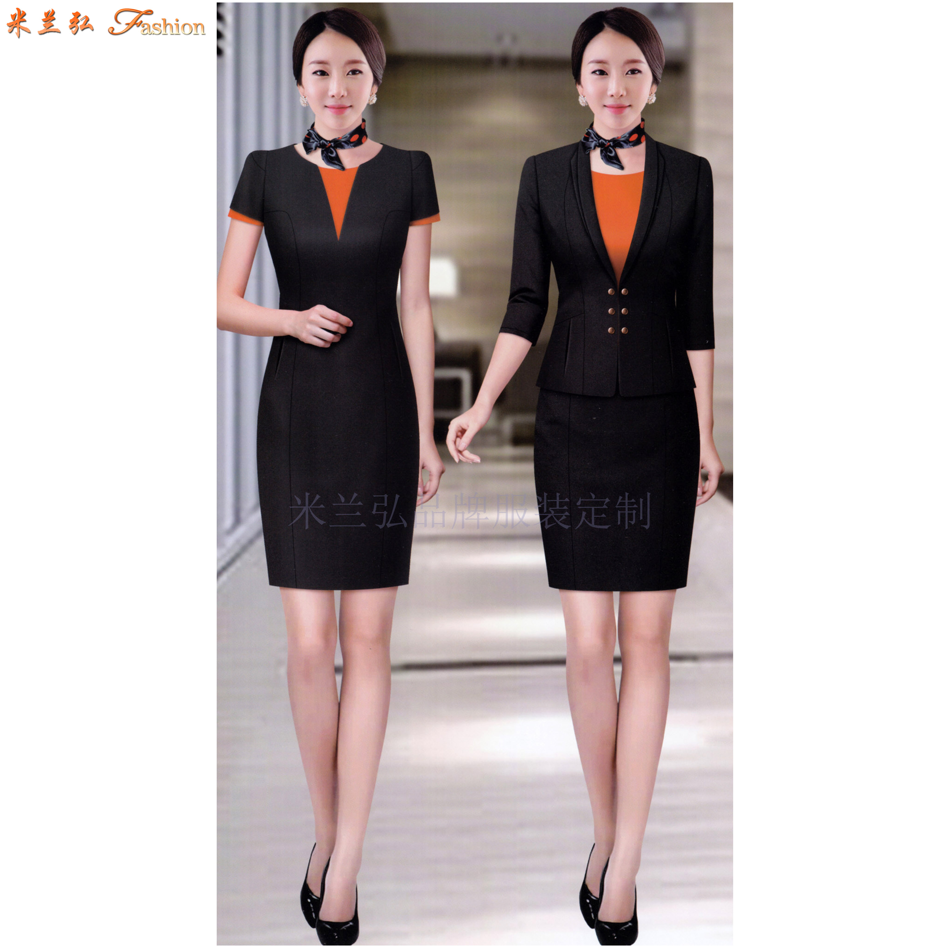 气质黑色连衣裙图片,夏季女职业装套裙搭配图片:Temperament black dress picture, summer women's professional dress set matching picture 米兰弘欢迎各企事业单位来我公司指导、洽谈工作服订做。