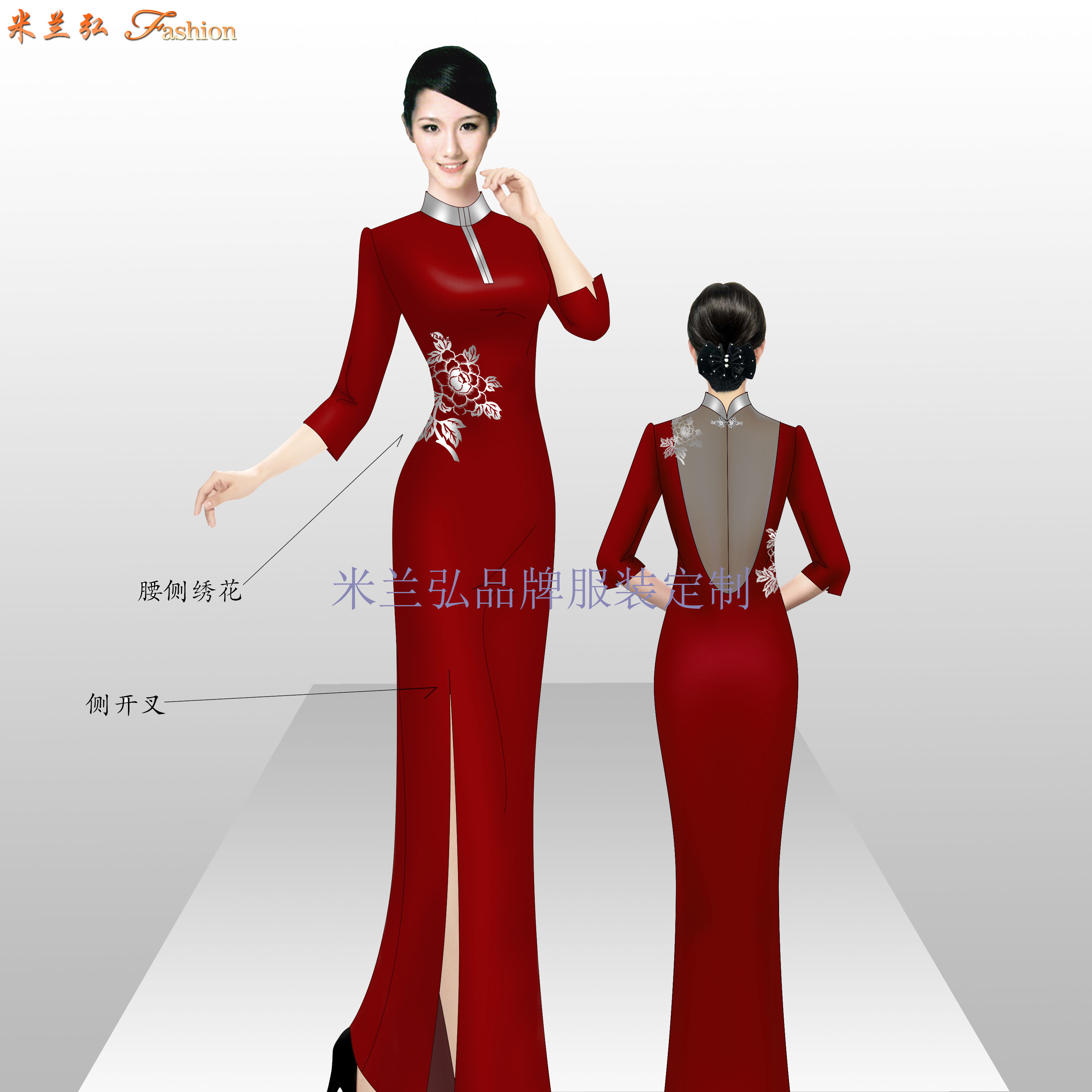 中式优雅旗袍图片,礼仪旗袍定做款式图片:Chinese elegant qipao picture, custom qipao style picture for etiquette 米兰弘欢迎各企事业单位来我公司指导、洽谈工作服订做。