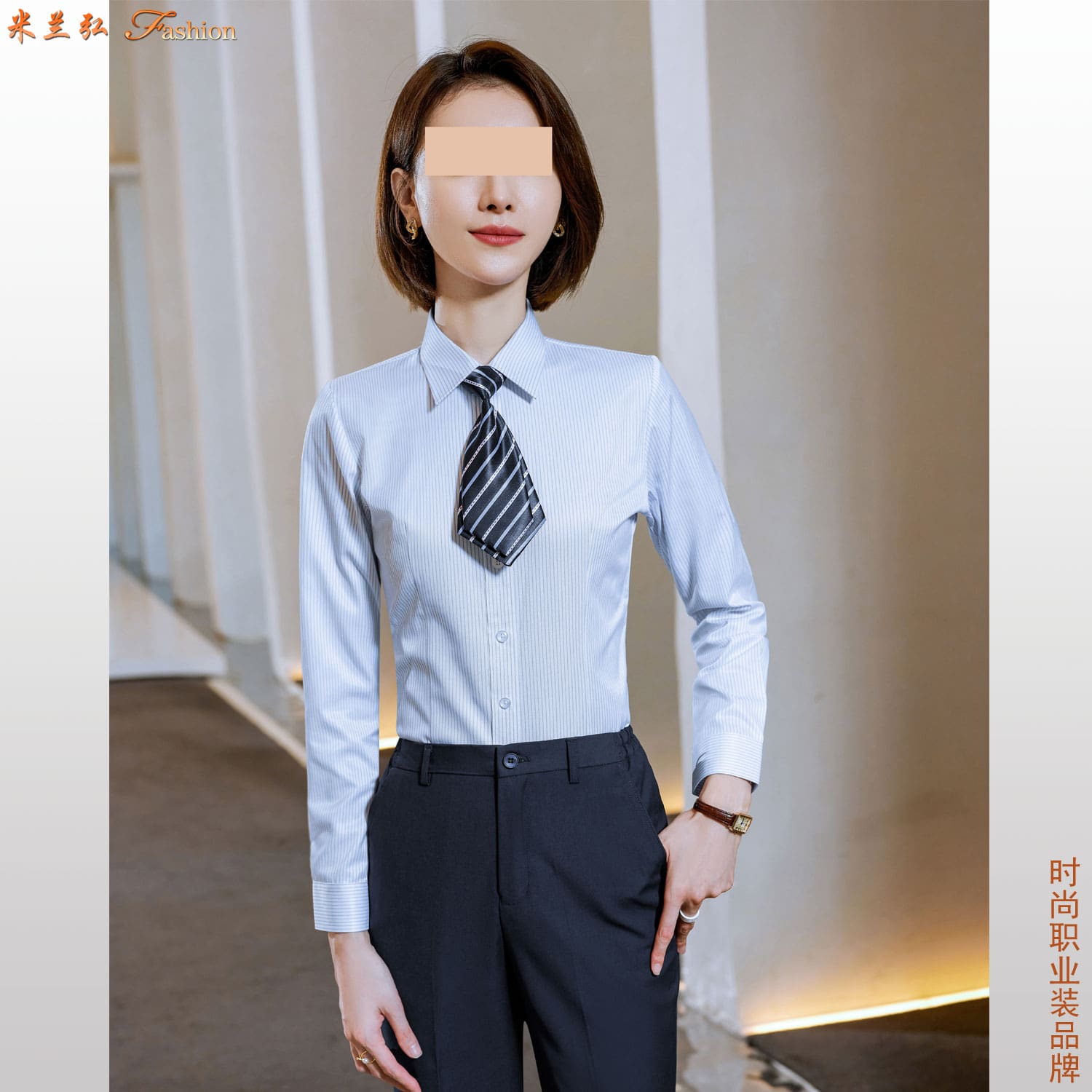 同款职业白衬衫样式图片,品牌衬衫搭配图片:Same-style professional white shirt images, brand shirt matching photos 米兰弘欢迎各企事业单位来我公司指导、洽谈工作服订做。