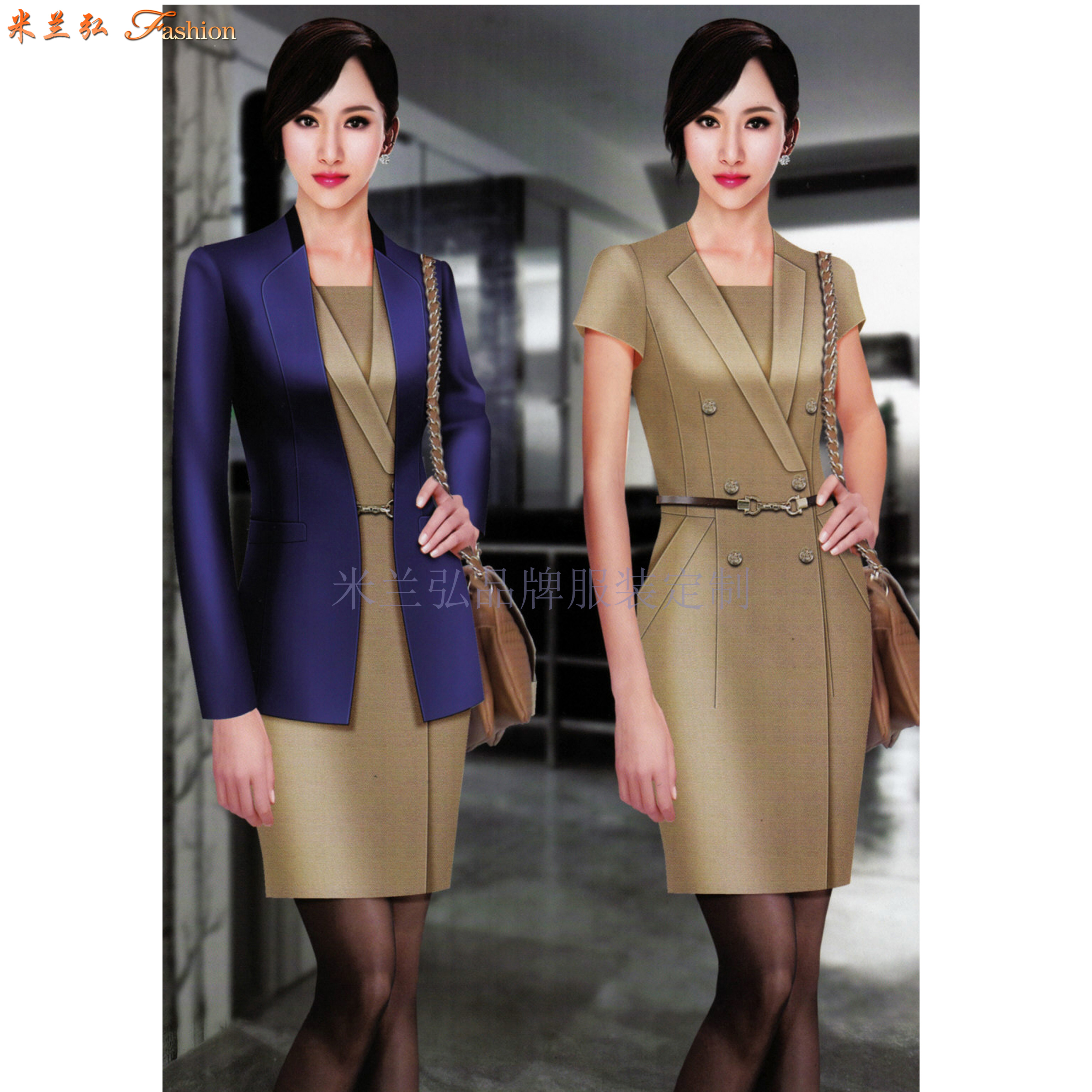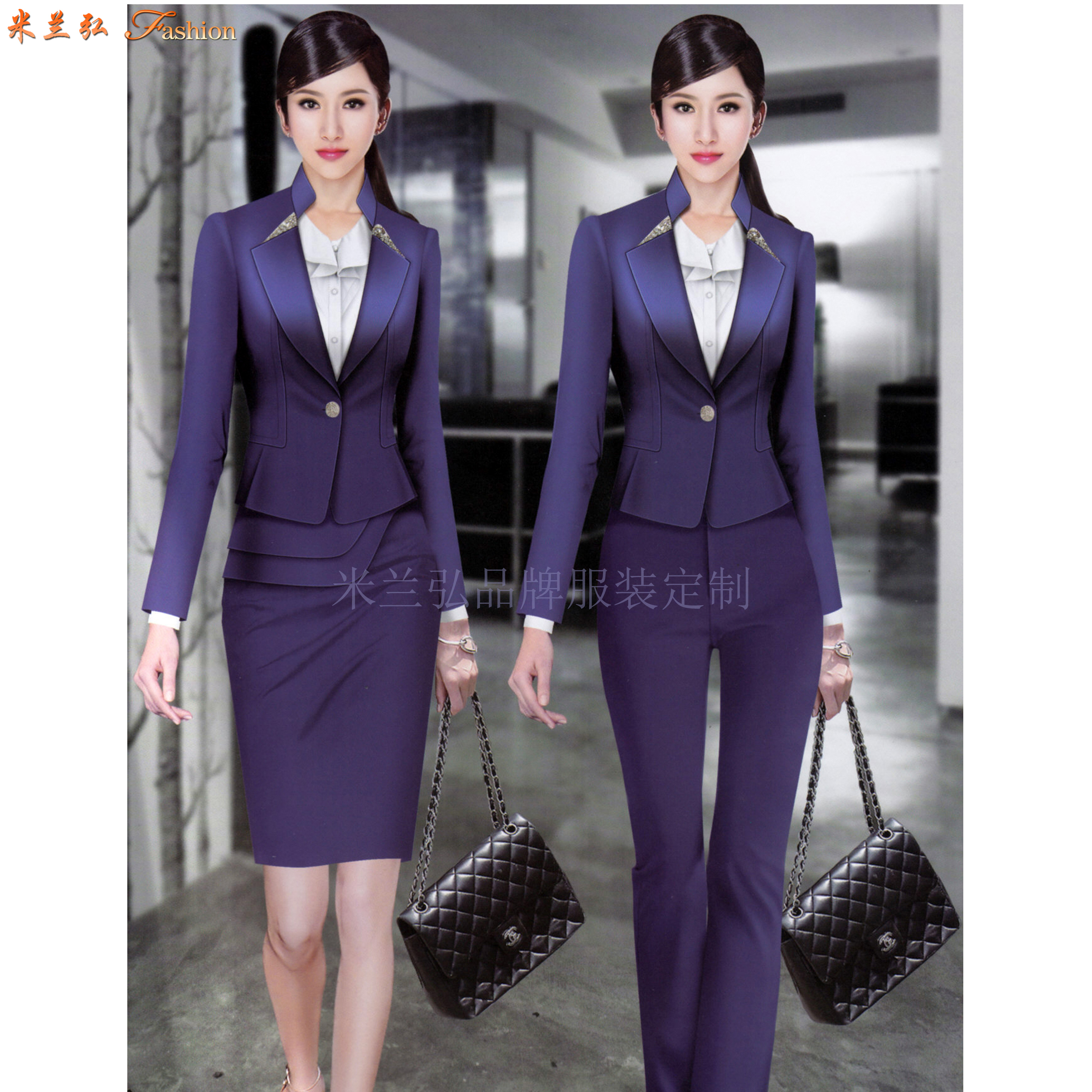 气质女职业装图片,品牌职业装穿搭图片:Temperament women's professional clothing pictures, brand professional clothing dressing pictures 米兰弘欢迎各企事业单位来我公司指导、洽谈工作服订做。2025-04-16